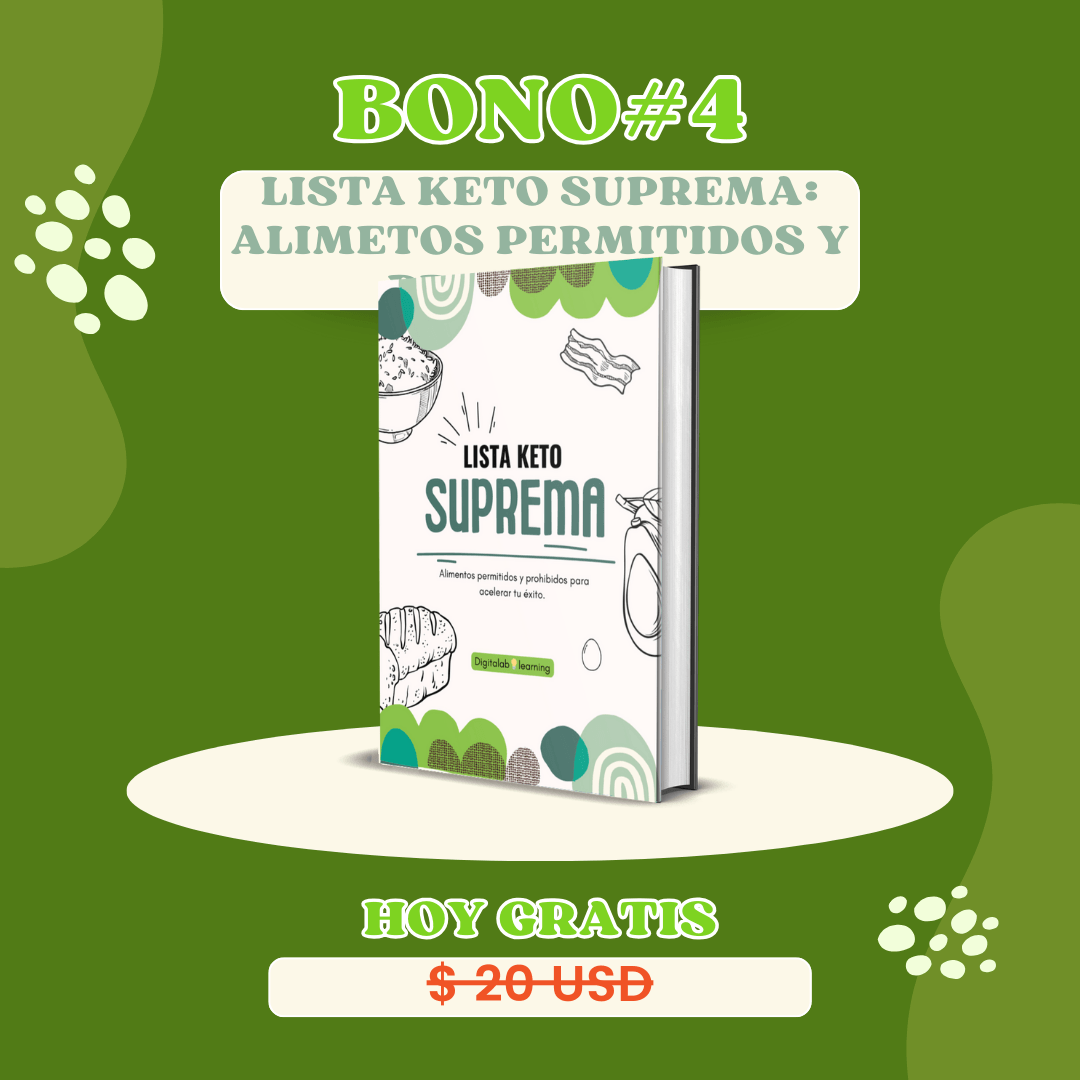 Bono 4 - Lista Keto Suprema: Este e-book esencial te muestra exactamente qué alimentos incluir y cuáles evitar para maximizar los beneficios de la dieta cetogénica.