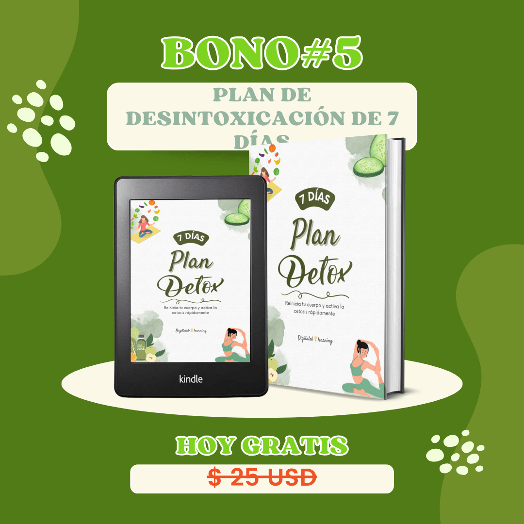 Bono 5 - Plan de Desintoxicación De 7 Días: Revitaliza tu cuerpo en solo una semana. Este libro te ofrece consejos prácticos y un plan diario para eliminar toxinas, aumentar tu energía y mejorar tu bienestar general.